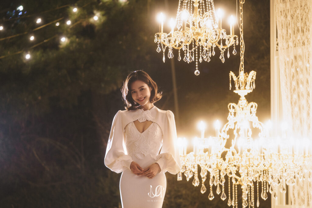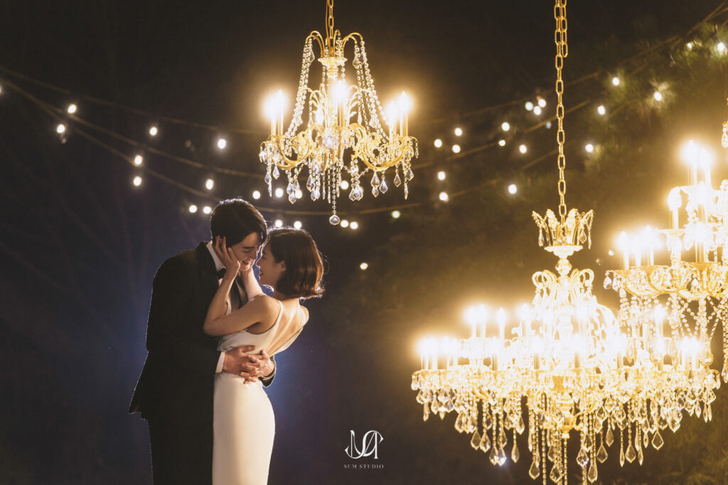 バックにお庭を活かしたシャンデリアのセットは