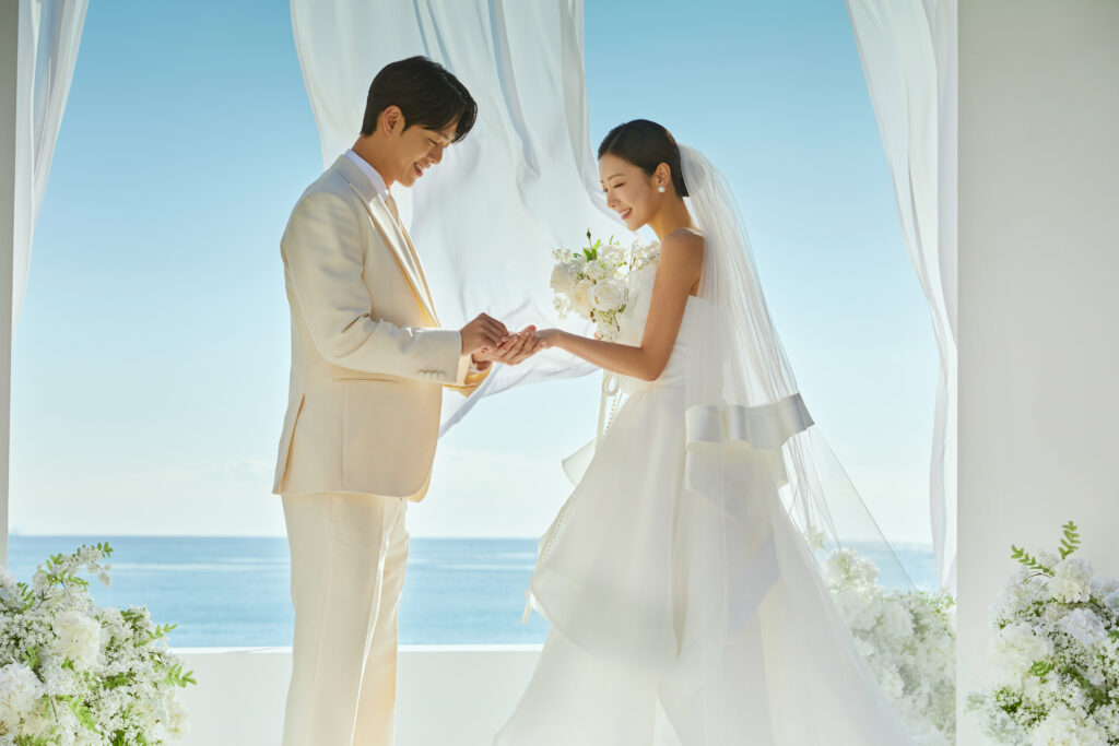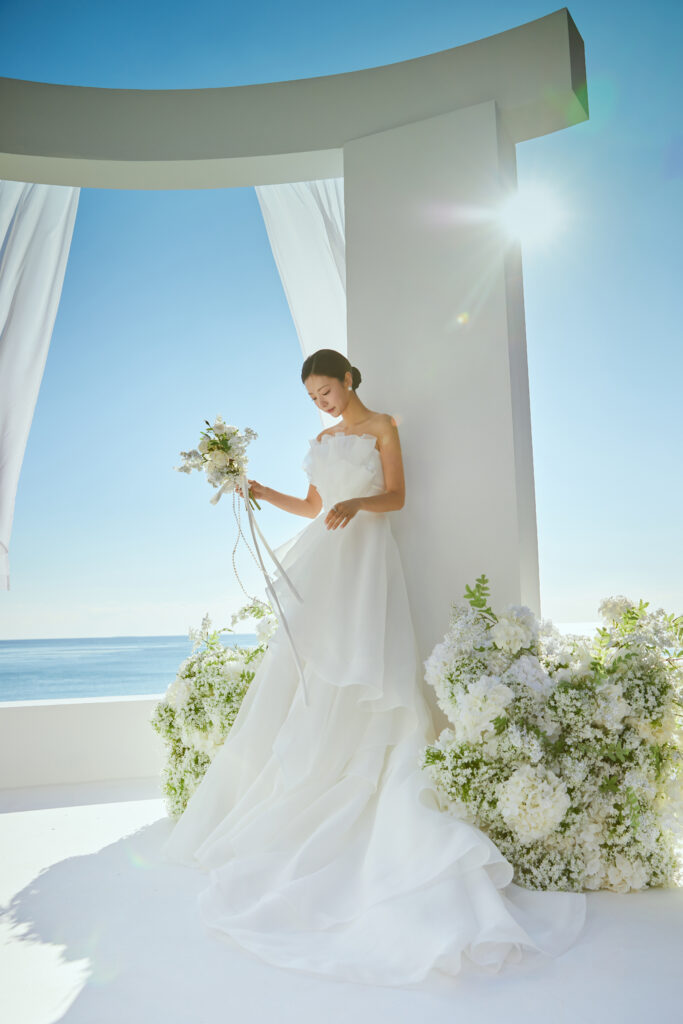 海が後ろに見えるJ&スタジオのロケーションならではのチャペルのようなセット🤍